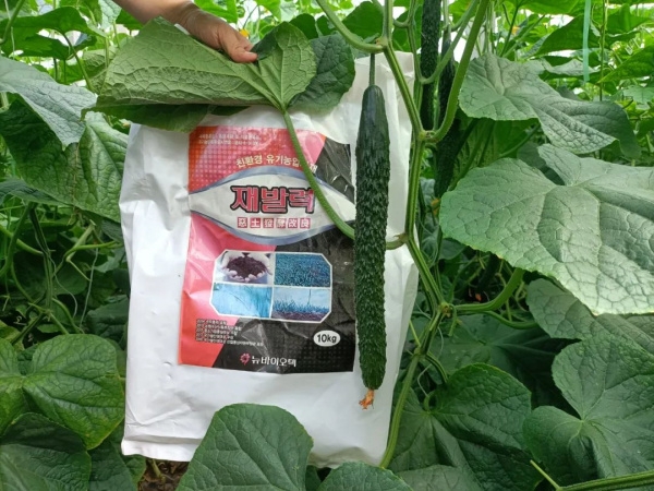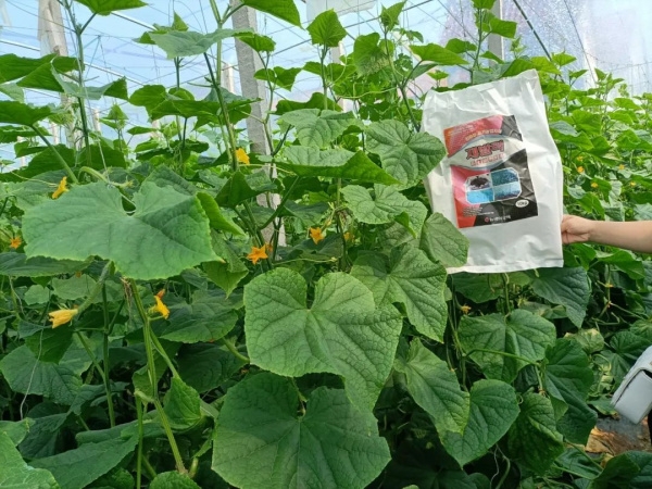 情况介绍:潘师傅的拱棚一亩地,是2016年建的,基本是种植黄瓜套种苦瓜。“种植越夏黄瓜很难管理,死棵、病毒、早衰等问题很突出,尤其是去年,我棚里的东侧一半的区域死棵很严重,所以今年定植之前,我到我们村欣宏农资有限公司张金亮经理处咨询,张金亮经理推荐我使用江南网页版改良剂。也是抱着试试看的态度,我在棚内进行了对照试验!”潘师傅的妻子介绍道,她5月12日在死棵严重的东侧10间沟施江南网页版改良剂,西侧作为对照区,5月15日定植黄瓜。说到两侧的表现,潘师傅和妻子都非常满意,主要是以下几点: